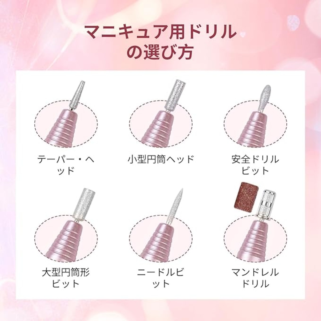 ネイルドリル:ペンのような形をしており、小さくて繊細なので持ち運びが簡単。交換用ドリル6本付き。本製品の電源には、過負荷や過熱から保護するチップが内蔵されています。ネイルドリルが作動しない場合は、電源を切ってリセットしてください。