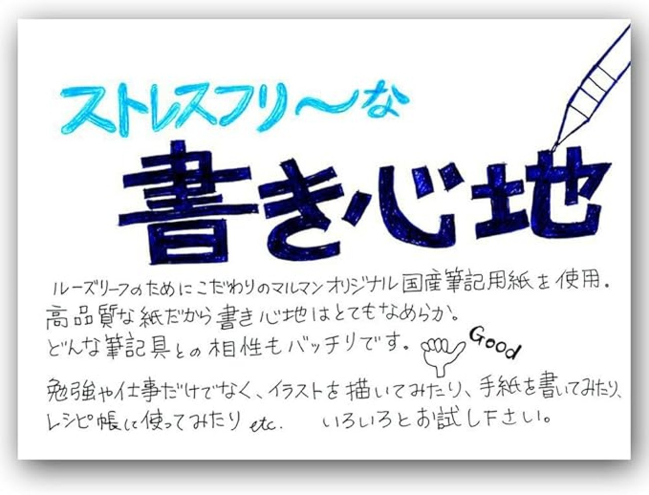 筆記用紙は、マルマンルーズリーフ共通の80g/m2を使用、あらゆる筆記具を使っても「書きやすさ」を実感できるよう、紙表面の滑らかさを重視して作られた「筆記」のための紙です。ペン先が引っかかることなく、滑り過ぎない書き心地を実感していただけます。インクのにじみやウラ側へのインクの抜けもほとんどなく、鉛筆からボールペン、万年筆、マーカーまで安心してお使いいただけます。中性紙ですので保存性にも優れ、環境にも配慮された用紙です。