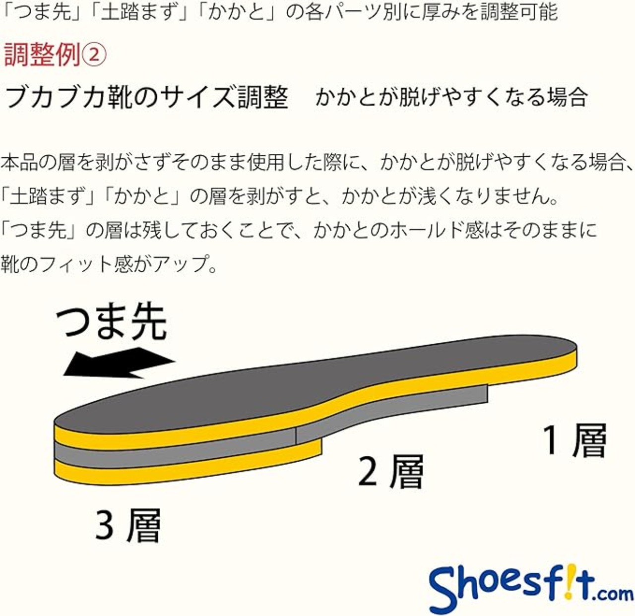 商品特長 つま先、土踏まず、かかと、3つの部位別に厚み調整が可能!自分好みのサイズ感に調整できます。
