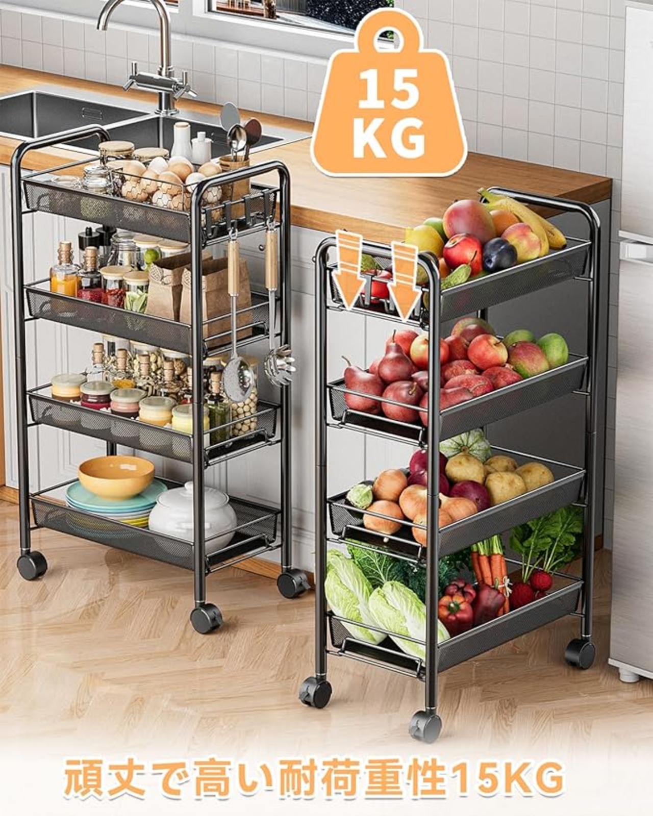 【耐荷重】-EKNITEY キッチンワゴンはしっかりした。棚板1枚あたりの耐荷重15kg、様々な物品に対応できます。