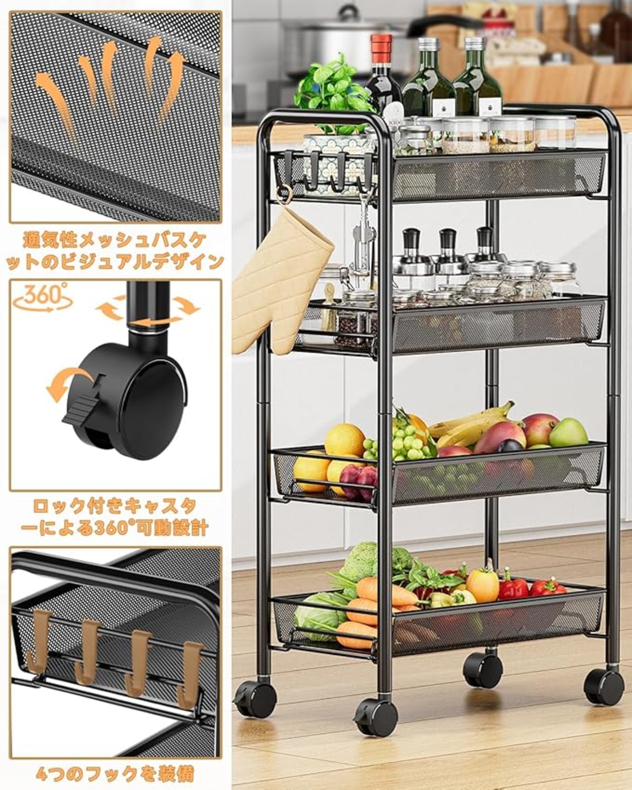 EKNITEY キッチンワゴン ワゴン キャスター付き 4段 キッチン棚 隙間収納 多機能 キッチン 洗面所 浴室用 洗濯機 幅26.5 奥行45.5 高さ84.5cm ブラック