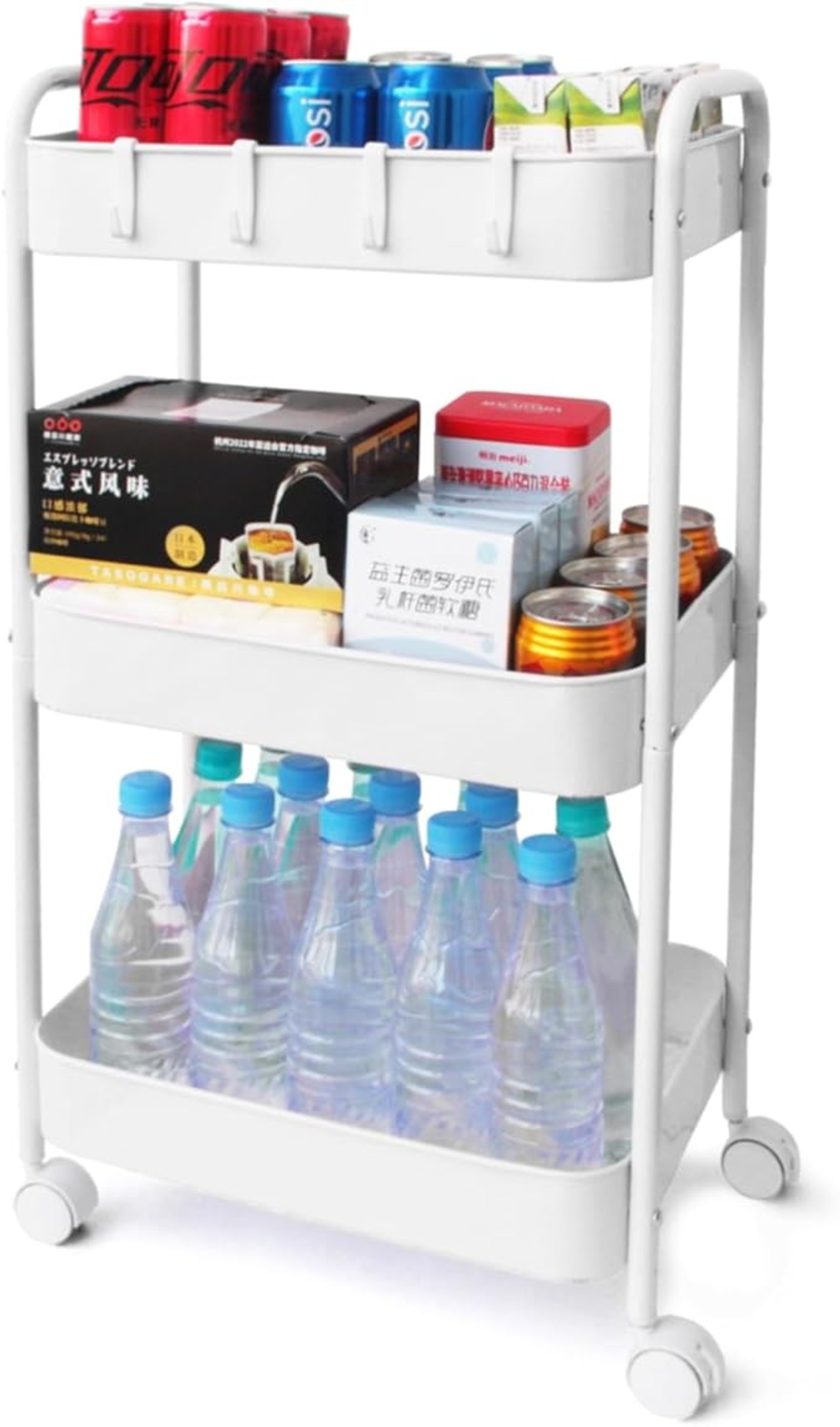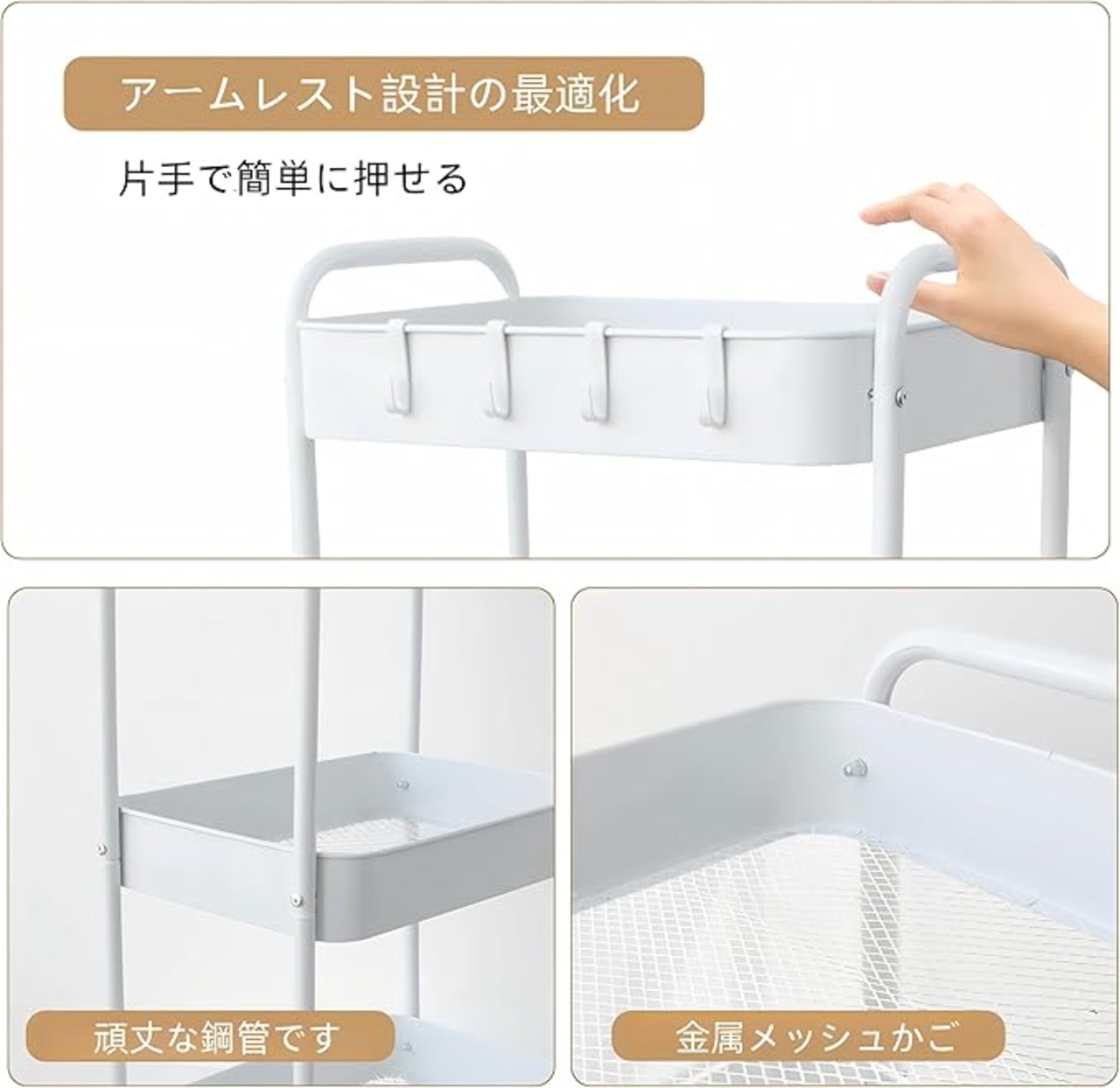 キッチンワゴン 3階建て、4つのサスペンション装置を備えた移動実用カートは、キッチン、寝室、オフィス、ランドリー、狭いスペース,白