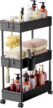 キッチンワゴン キャスター付き ワゴン 隙間収納 スリム 収納カート キッチン 洗面所 収納 13.5cm 18cm 22cm 冷蔵庫横 台所 浴室 トイレ 細い棚 3段 4段 おしゃれ 組立簡単 フック&収納カップ付き (3段式-[22cm]-ブラック)