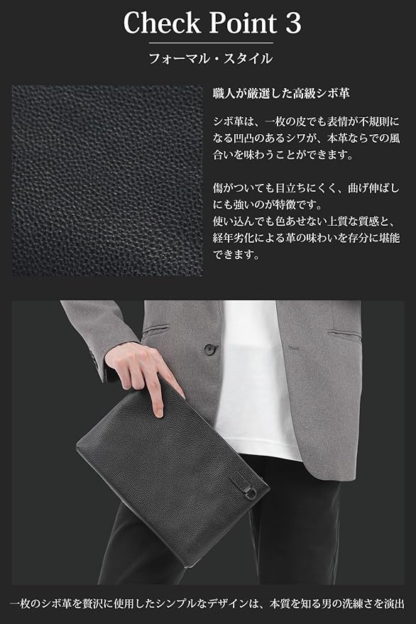 【デザイン性】上品さと機能性を兼ね備えた、大人のためのクラッチバッグ。高級感のあるフェイクレザー素材を使用し、どんなシーンにも自然になじむシンプルなデザインに仕上げました。