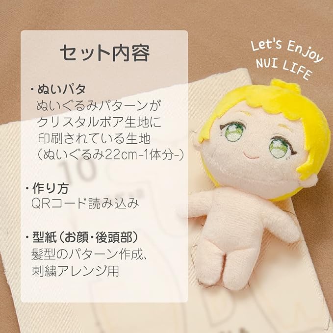 人型のぬいぐるみが楽に作れちゃう便利なセット! クリスタルボアの生地に、ぬいぐるみのパターンが印刷されているので面倒な型紙の書き写しも不要。