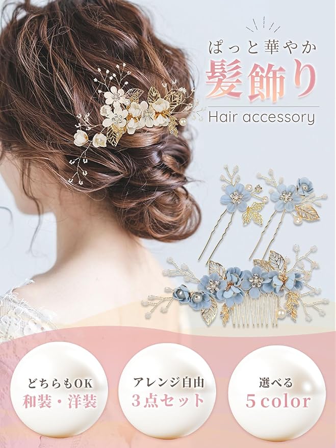 【ヘアスタイリスト監修】 髪飾り ヘアアクセサリー (3点セット)和装/洋装どちらもOKx選べる5色展開x結婚式や卒入学式にも(ホワイト)