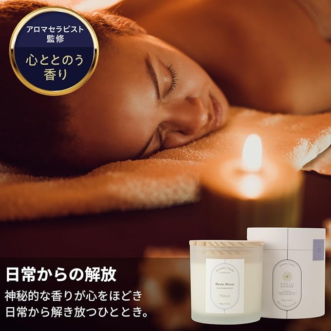 FIOLLU アロマキャンドル Mystic Bloom は、アロマセラピスト監修の“心を深くととのえる”神秘的な香り。 ローズの上品さに、アンバーとムスクの奥行きが重なり、まるでスパにいるような没入感を生み出します。 天然ソイワックス&蜜蝋を使用し、煙の少ない穏やかな灯りとともに癒しの空間を演出。 シンプルで上質なデザインは、クリスマスギフトや誕生日、母の日、引っ越し祝いなど、大切な方への贈り物にも最適です。 “日常からの解放”を感じる特別なひとときを、自分にも、大切な方へも。
