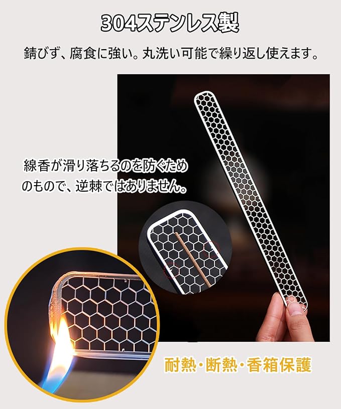 【灰飛散防止フタ付き】画期的な蓋付きデザイン+内蔵ステンレス防火シートで、灰の飛散を効果的に防止。横置きタイプなのでリビングや書斎など様々なシーンで使用可能。ペットやお子様のいるご家庭でも安心してお香をお楽しみいただけます。