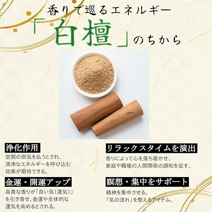 心を落ち着かせる白檀の香りで、瞑想・リラックスタイム・空間浄化に最適。
