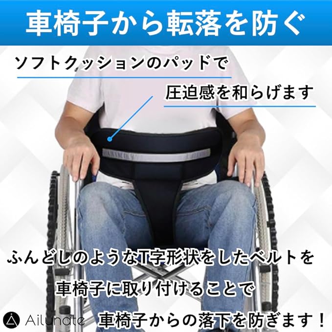 ふんどしのような形状をしたベルトを車椅子に取り付けることにより、車椅子からの落下を防ぎます。
