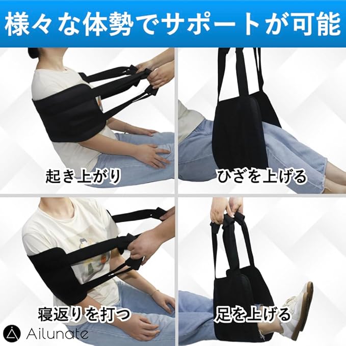 ベッドの起き上がりや車椅子から立ち上がる際に移乗ベルトで体を包んで体を起こせます。様々な体勢の補助が可能で足や膝の持ち上げが可能です。寝返りや体位変換のサポートにも役立ちます。