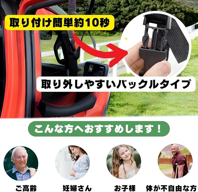 この補助ハンドルは、高齢者や介護が必要な方、または怪我や病気で体力が低下している方が車の乗り降りをする際に最適です。車のドアフレームに簡単に取り付けられ、使用しないときはコンパクトに収納できるため、スペースを取りません。どんなシーンでも安全で快適な乗り降りをサポートします。