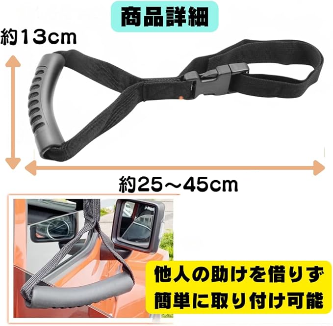 本製品のハンドル部分はコンパクトながらも握りやすい形状で、長さは調整可能です。最短25cmから最長38cmまで伸ばすことができ、使用者の体格や車の構造に合わせて最適な長さに調整可能です。また、ストラップの幅は3cmで、安定感を確保します。
