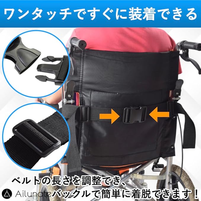 車椅子の後側に通し、バックルで固定でき、ワンタッチで着脱できます。また、ベルトの長さを調整でき、締め付け具合を調整できます。