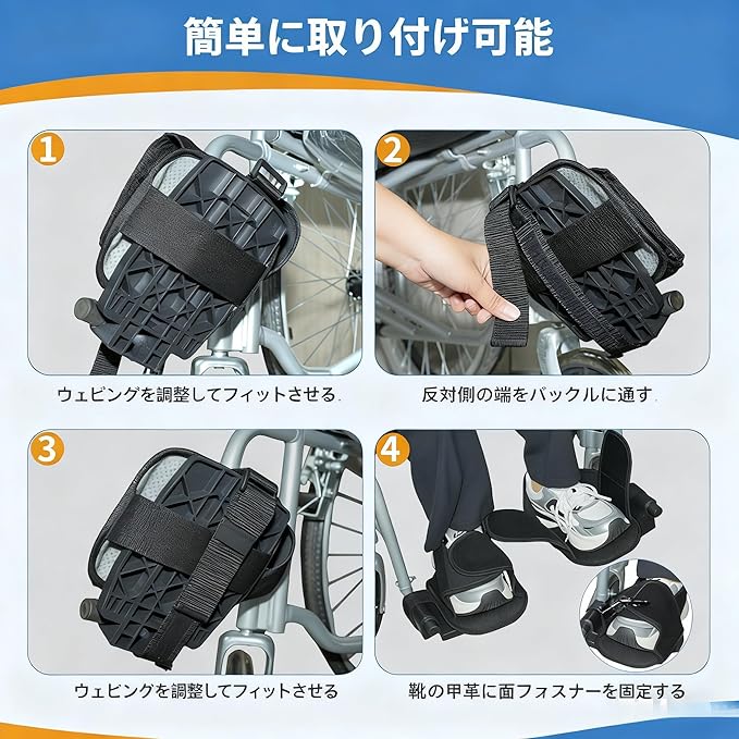 【調節可能でほぼ全車種対応】伸縮性と調整幅のあるストラップが、さまざまな足のサイズ・形状(スニーカーからローファーまで)に柔軟対応。ほとんどの車椅子・シニアカーのフットレストでご使用いただけます。