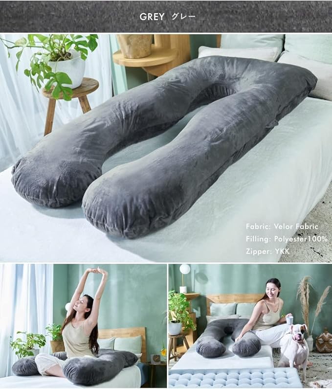 HUGMIN ハグミン 抱き枕 【 だきまくら U字型 マタニティ 妊婦用 授乳クッション 】 腰痛 妊婦 快眠サポート 【 妊娠中・産前産後・授乳サポート 】 体圧分散 ロングクッション 寝返りスムーズ 睡眠改善 【 全身を包み込む抱き枕 】 抗菌防臭の洗えるカバー 防ダニ補充綿付 | 約140 80㎝ | ミディアム |高級ベロア |グレー