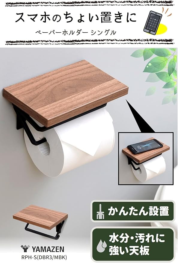 山善(YAMAZEN) トイレットペーパーホルダー 棚付き (スマホ置き/インテリア) シングル 汚れに強い天板 かんたん設置 幅17.5 奥行11 高さ9cm ダークブラウン/マットブラック RPH-S(DBR3/MBK)