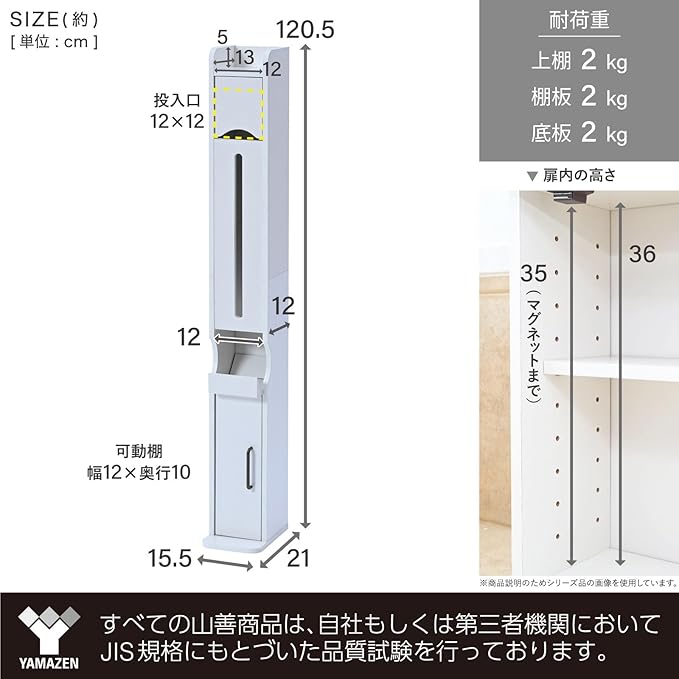 ●サイズ(約) : 幅15.5 奥行21 高さ120.5cm●耐荷重 : 天板2㎏、底板2kg、棚板2kg●構造部材 : プリント紙化粧パーティクルボード、プリント紙化粧繊維板●東証プライム(株)山善で扱うすべての山善商品は、自社もしくは第三者機関において、JIS規格に基づいた品質試験を行っております。