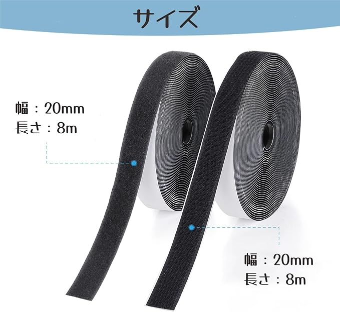 面ファスナー 両面テープ付き 超強力マジック貼付テープ 粘着力強い 防水 耐熱 DIY用 網戸用 車用 業務用 工業用 オスメス ブラック 20mm*8m