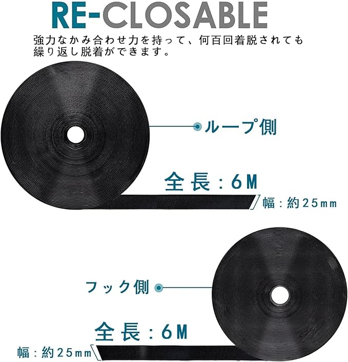 【セット内容】ファスナーテープ 2巻(フック側 1巻+ループ側 1巻)、カラー:ブラック幅:約25mm、全長:6m