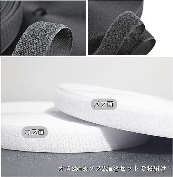 幅:25mm/長さ:25メートル/カラー:白(ホワイト)、黒(ブラック)/オス25m+メス25mのセット/※裏面に粘着テープは付いていません。