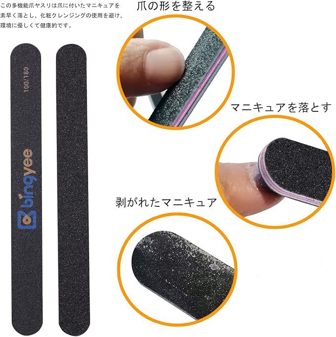 100/180両面爪やすり:ネイルやすり100グリットは粗く、爪からジェルを取り除くのに役立ちます. 木目180側は細心の注意を払っており、爪のエッジをカットして形状を洗練するのに役立ちます.