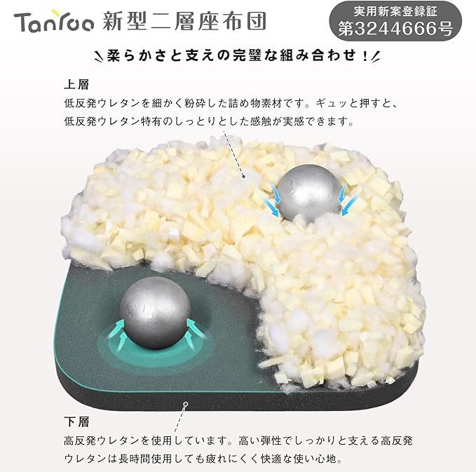 【低反発ウレタンチップ4cm 高反発ウレタン3cm二層構造】中材は低反発ウレタンチップ4cmと高反発ウレタン3cmの2層構造で、底付き感もなし、包み込まれるような柔らかい座り心地と快適な弾力性をもっています。上層は低反発ウレタンを細かく粉砕した詰め物素材です。ふわふわ&もちもち感、通気性もばっちり。ギュッと押すと、低反発ウレタン特有のしっとりとした感触が実感できます。しっとりと体に馴染む座り心地です。下層は高反発ウレタンを使用しています。高い弾性でしっかりと支える高反発ウレタンは長時間使用しても疲れにくく快適な座り心地。密度の高い高反発ウレタン中材は耐久性にも優れています。(実用新案登録証第3244666号)