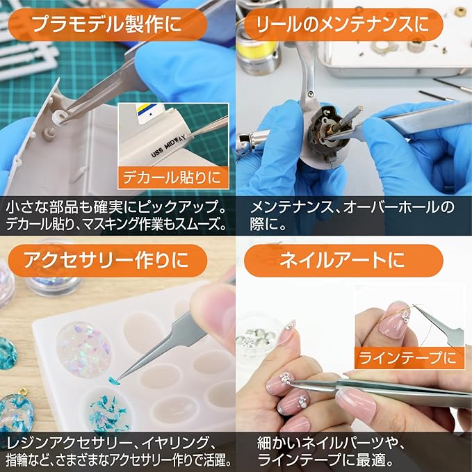 頑丈な構造とスタイリッシュで洗練されたデザインにより、微細な作業はもちろん、やや堅固な部品の操作もスムーズかつ正確に行えます。ネイルアートやまつエク、刺抜き・毛抜き、プラモデル作り、デコブロック、ビーズ細工、魚の小骨抜き、パズル、キャラ弁作り、ネジ掴みまで、幅広い用途に対応可能で、家庭用からプロの作業まで頼りになる万能ツールです。