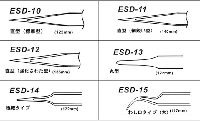 精密ピンセット内容:ESD-10、ESD-11、ESD-12、ESD-13、ESD-14、ESD-15 、精密/極細 ピンセットです。