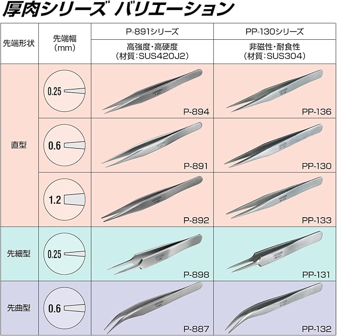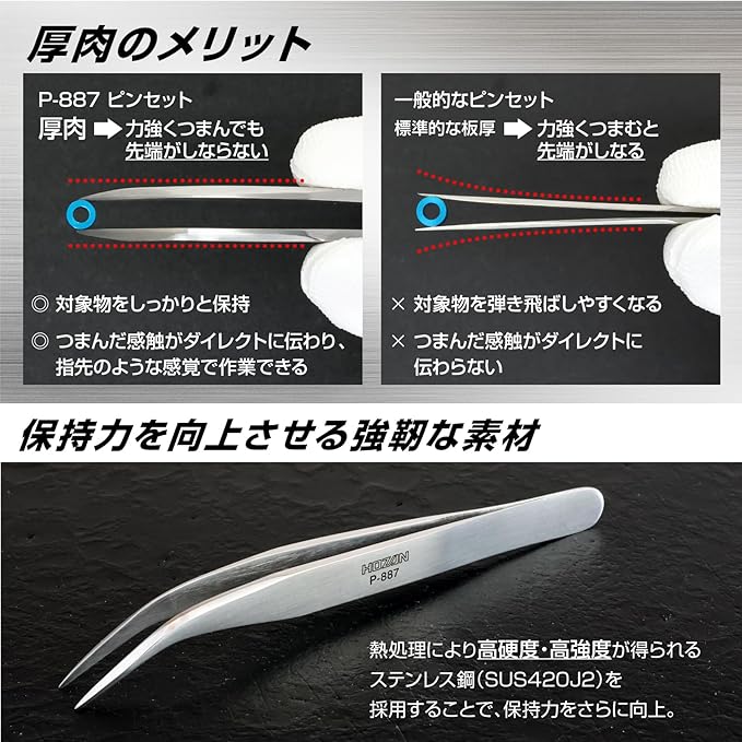 【強力でしなりにくい高耐久ピンセット】 P-887ピンセットは、板厚2.3mmの頑丈なステンレス素材(SUS420J2)を採用し、熱処理を施すことでさらに強靭な耐久性を実現。強くつかんでもしなりにくく、手に伝わる感触がしっかりしているため、精密作業や微細なパーツの取り扱いでも対象物を確実に保持できます。ハンダ付けや電子部品の組立、模型製作、アクセサリー作りなど、細かい作業が多いプロの現場でも安心して使用できる強力型ピンセットです。