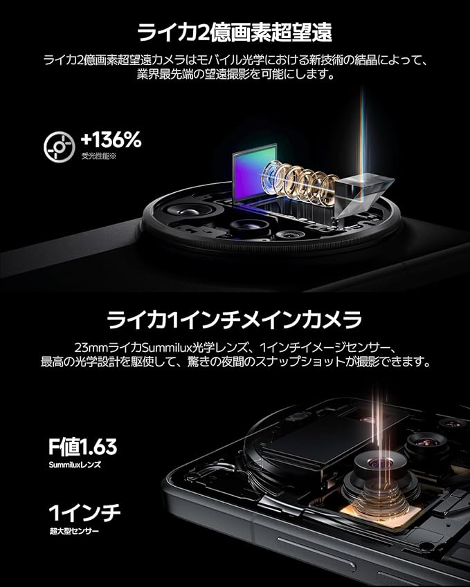 ✅2億画素望遠カメラ搭載:最も革新的なライカ2億画素超望遠カメラは、業界最高レベルの焦点距離100mmで、遠くの被写体を簡単に撮影できます。1/1.4インチの大型センサーとF値2.6の絞りを組み合わせることで、Xiaomi 14 Ultraよりも136%多くの受光性能を実現しました。撮影距離や明暗環境を気にせず、撮影することができます。