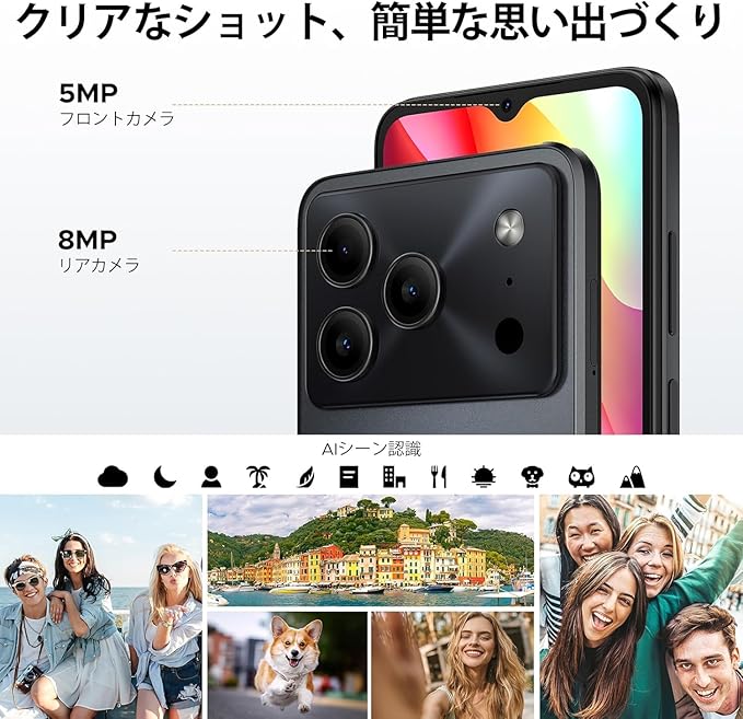 【6150mAh大容量バッテリー+8MPAIカメラ】6150mAhの大容量バッテリーにより、長時間使用可能。ゲームや映画、通話など、1日中快適に使用できます。8MPメインカメラ は、鮮やかで美しい写真を撮影できます。AI機能を活用し、夜景モードやポートレート撮影が簡単にできます。