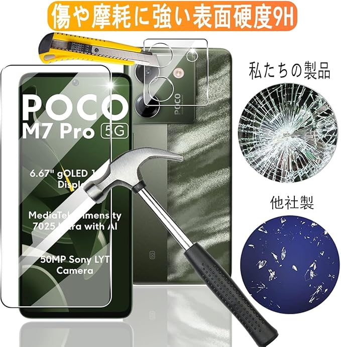 【9H強度&飛散防止】対応 シャオミ POCO M7 Pro 強化ガラス 保護フィルムは日本旭硝子素材を採用します。 落下、スクラッチ、衝突、衝撃に高い耐久性があります 衝撃を最小限に抑えて画面の破損を抑え。カッターなどの鋭利なものを当たってもキズが付きにくくて高い強度を持ち表面硬度9Hが特徴です。特殊な飛散防止設計により、万一割れてしまった際にも飛散することなく、高い安全性を実現します。