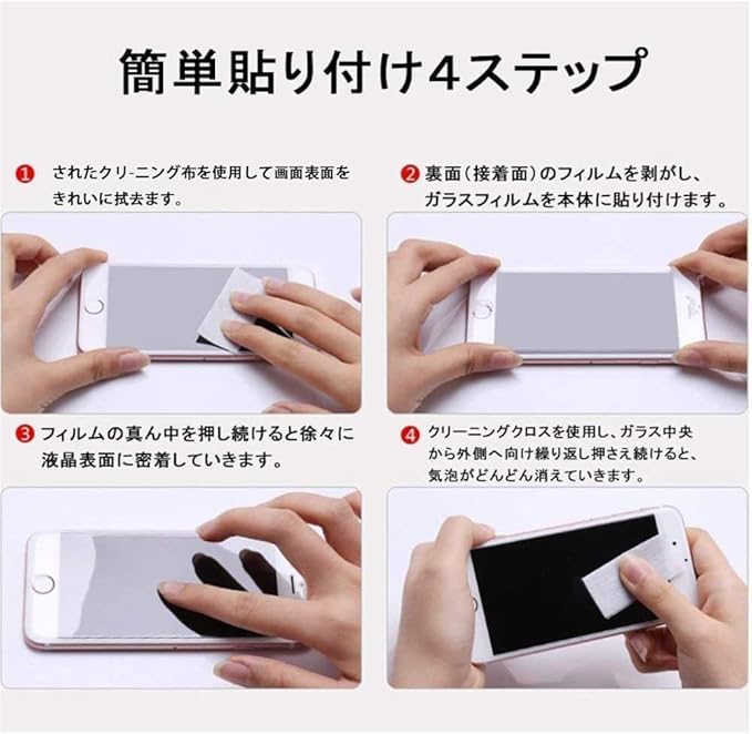 【簡単貼り付け】位置に合わせるだけで、貼付けツールを軽く押さえるとまるで吸い付くように簡単に貼付き、気泡が入りにくく、角を合わせてポンと中心を押すだけで貼りつけ完了、自己吸着機能!気泡が発生しにくいので、綺麗に貼り付けられます。ガラスフィルムをスマホの端面に合わせ、ゆっくり置かせていき四辺を押すと貼り付けます。また、初心者でも完璧に貼り付けられます、。