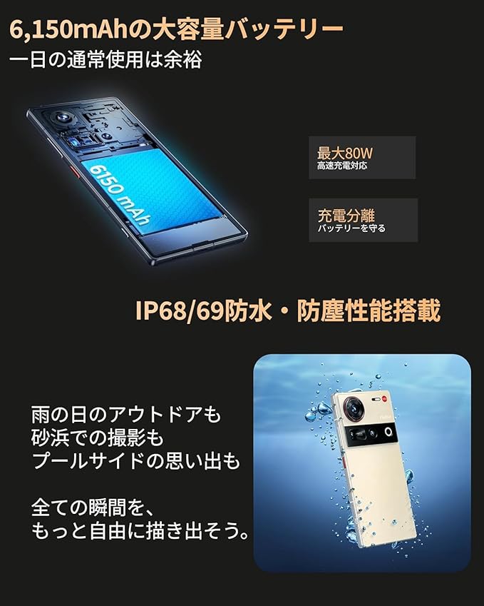 【6150mAhバッテリー&80W急速充電】薄型軽量化した本体に6150mAhの大容量バッテリーを内蔵。バッテリー切れしても、約45分で100%まで充電することができます。IP68および改良されたIP69等級により、完全防水・防塵を実現し、高温や高圧の水にも耐えます。晴れの日も雨の日も、この堅牢な構造で素晴らしい一日をお楽しみください。