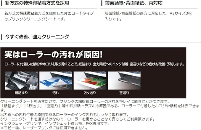 ■ 新方式の特殊微粘着方式を採用した片面コートタイプのプリンタクリーニングシートです。