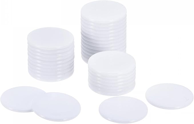 直径:24 mm; 厚さ:1.8 mm; カラー:ホワイト; 素材:プラスチック; パッケージ内容:50個 x プラスチックチップカウントチップ。