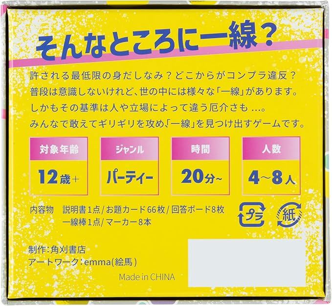 許される最低限の身だしなみ?どこからがコンプラ違反?どこからが都会? 普段は意識しないけれど、世の中には様々な「一線」があります。しかもその基準は人や立場によって違うという厄介さも。。。みんなであえてギリギリを攻め、「一線」を見つけ出すゲームです!