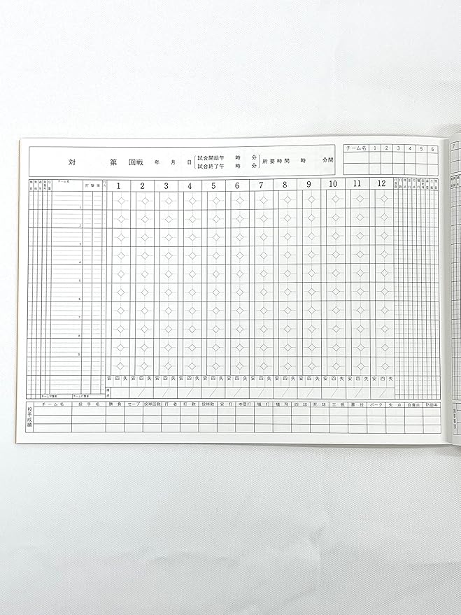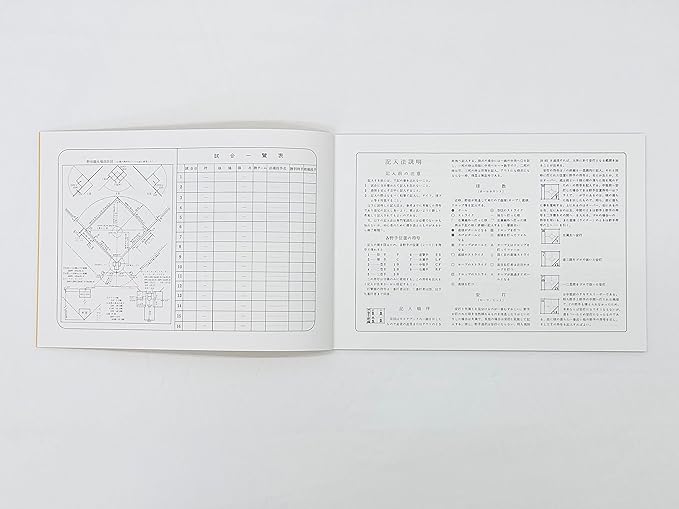 本を開いて左ページに先攻チーム、右ページに後攻チームのプレーを記録していきます。 記入欄の線にはメリハリがあり書込みやすいよう細かな気配りがされています。 薄くて軽いので持ち運びに便利です。 表紙は柔らかく左開き。 低価格なのでまとめ買いをされる方も多いモデルです。 SO社のエントリーモデルでありロングヒット商品です。 表紙サイズ・縦 横 18.3 26.5(cm)