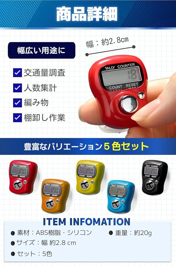 【幅広いシーンに活躍】指に装着したままのカウントが可能なので、幅広いシーンでの使用に大活躍します。かぎ針編みの編み目のカウントやスポーツ・イベントなどの人数集計、交通量調査など多用途に役立ちます!