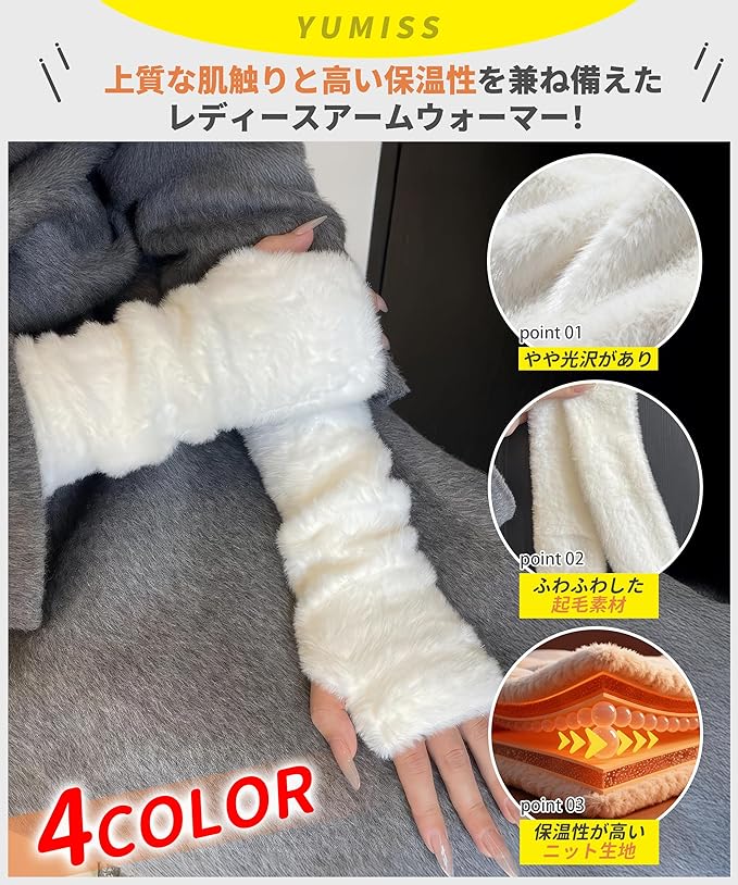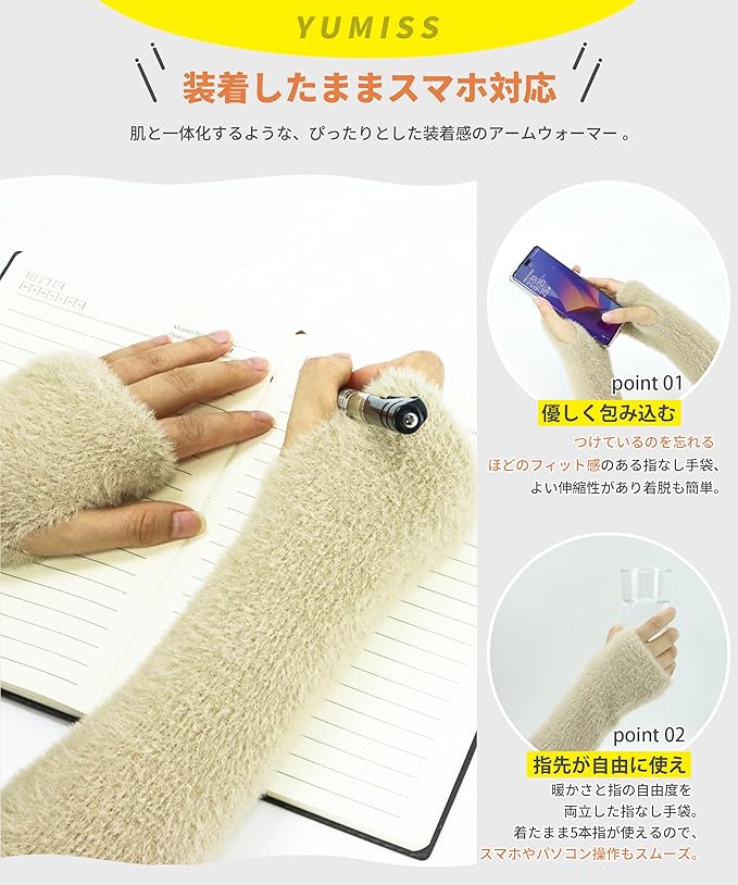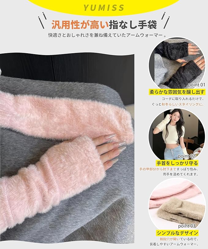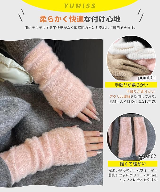 [YUMISS] 防寒手袋 指なし レディース 【肘下まで暖かくカバー・指先が自由に動き】アームウォーマー 親指穴付き ニット 暖かい 柔らかい スマホ対応 通勤 通学 自転車 アウトドア 寝るとき 手首ウォーマー てぶくろ