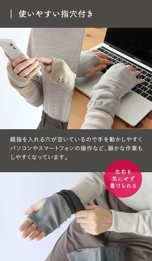 親指の穴があるので動かしやすく、手首から手の甲までしっかり温める事が出来ます。