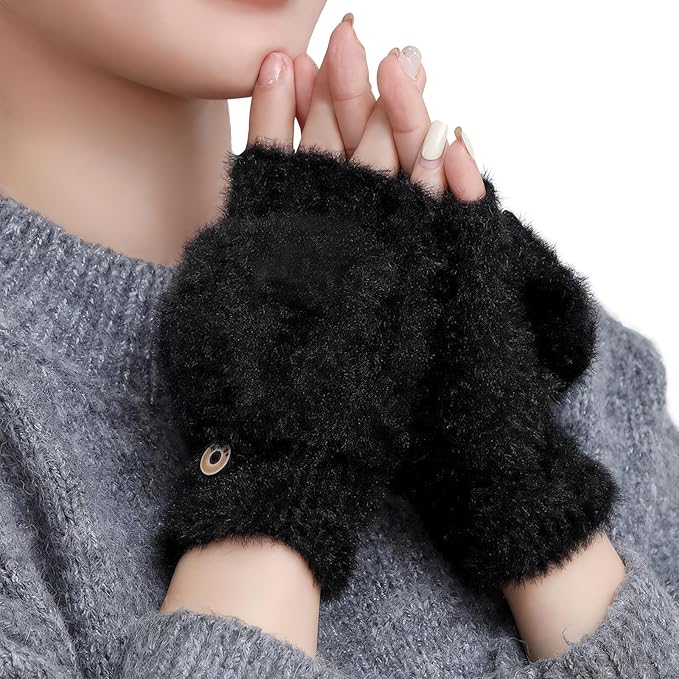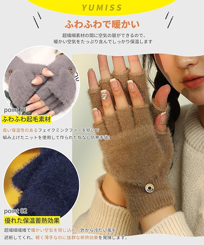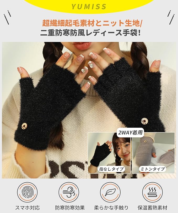 [YUMISS] 防寒手袋 指なし レディース 【2WAY仕様・超繊細保温蓄熱素材・ふわふわ柔らかな肌触り】 冬 スマホ対応 ミトン 保温 防風 柔らかい よい伸縮性 パソコン作業 自転車 アウトドア 指ぬき てぶくろ