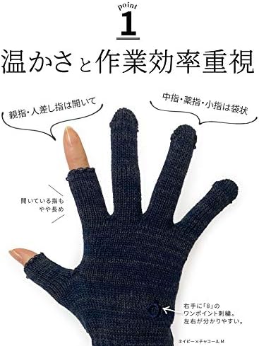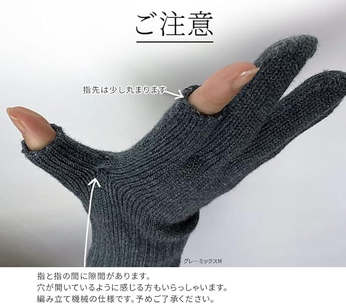 特徴:2つの指だけ開いたハンドウォーマー。親指・人差し指が開いていて、中指・薬指・小指は袋状です。スマホ対応手袋としてもおすすめです。編み目が大きくゆったり感があります。MとLは横幅がほぼ一緒ですが、Mはやや強めの伸縮糸を入れているので、手を入れるとMの方がきつめです。