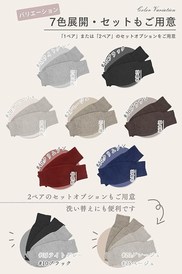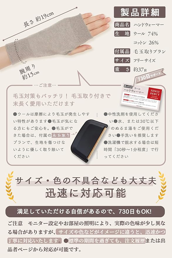 暖かさの秘密はウール74%の黄金比!本社のハンドウォーマーは、綿26%を混紡することで、「ウール特有のチクチク感」を解消し、ふんわり軽やかな極上の肌触りを実現しました。普通の手首ウォーマーと違い指先が出るデザインなので、家事、キーボードのタイピング、スマホ操作、書き物など、指の繊細な動きを妨げません。冷えやすい手首を優しく温めながら、冷たいデスクやPCとの接触を遮断し、冬のオフィス作業や在宅ワークに最適な冷え対策アイテムです。「ウールのリストウォーマーは毛玉が心配…」というお客様もご安心ください。専用の「毛玉取りブラシ」を同梱していますので、ウールの特性上、毛玉が発生してもすぐにお手入れが可能で、長く、大切にご愛用いただくためのHOTからの心遣いです。また、「使用や洗濯による予期せぬ損傷」「サイズが合わなかった」などのご心配は不要です。製品に同封されているサポートカードをご確認ください。お客様に末永くご愛用いただくための、HOTとして万全な体制を整えております。重さは約37gと超軽量で、付けていることを忘れるほどの快適さ。Freesizeでメンズ・レディース兼用。豊富なカラーバリエーションをご用意しており、ファッションのアクセントにも。1ペアまたは2ペアのセットオプションをご用意しており、洗い替えにも便利です。