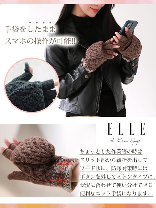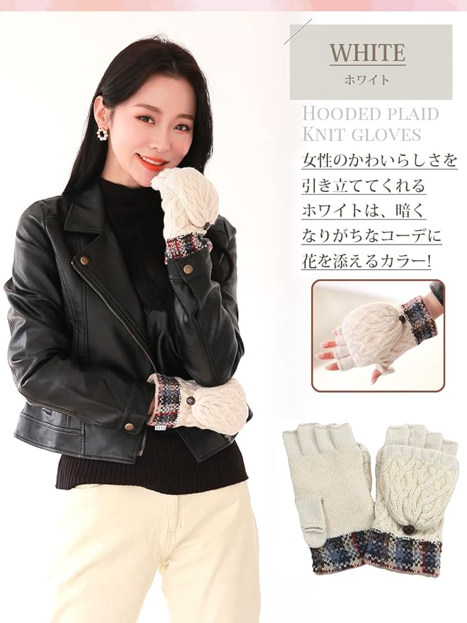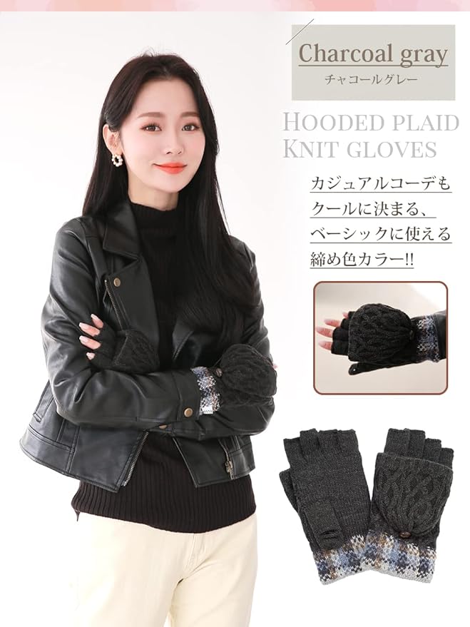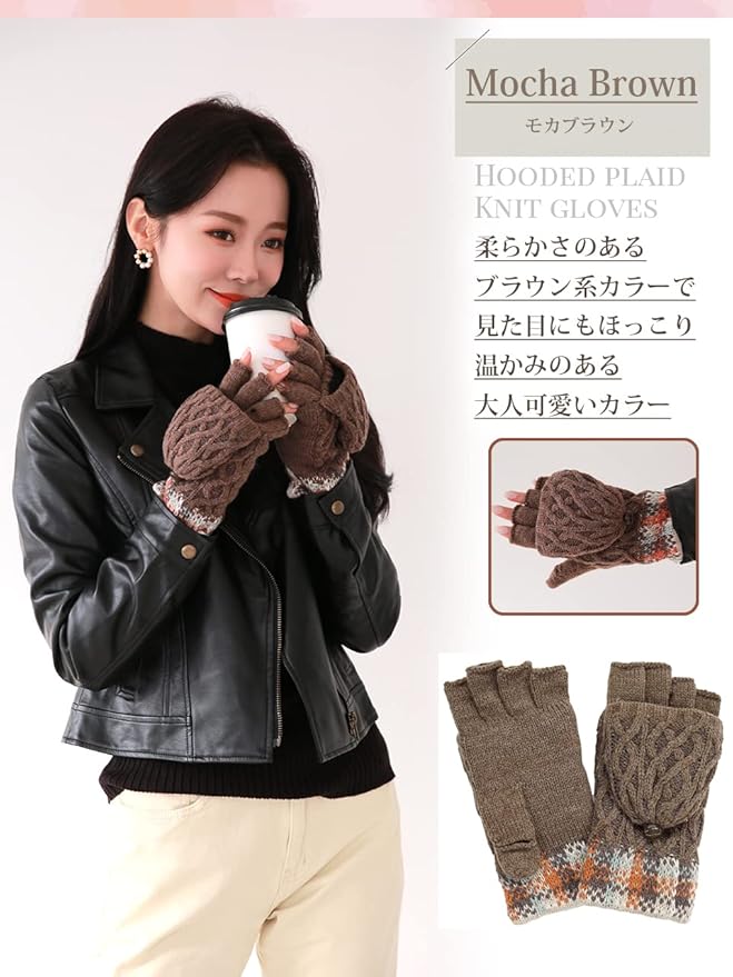 [エル] 2way フード 付き ケーブル 編み チェック柄 ニット 手袋 ミトン 指切 フィンガーレス レディース クリスマス プレゼント ギフト ケース付き