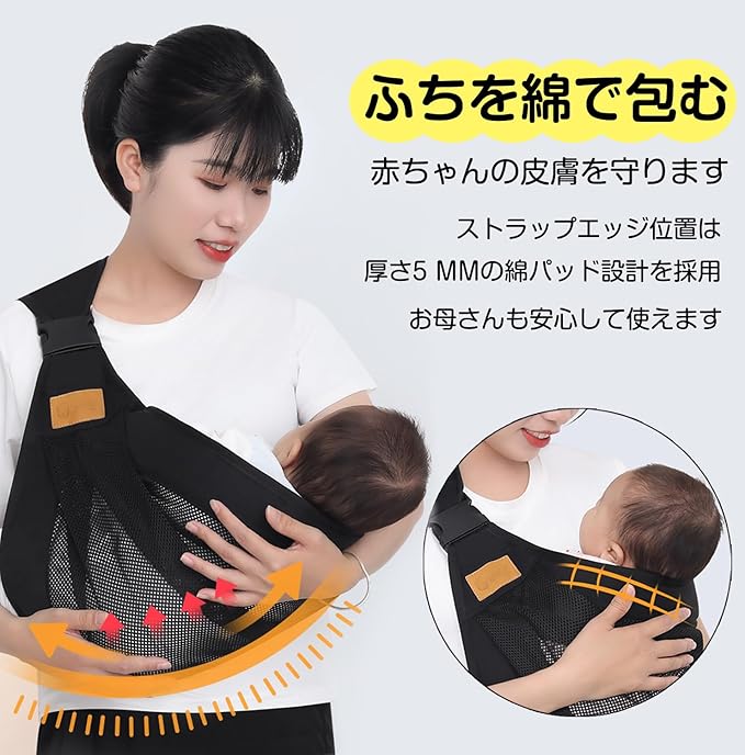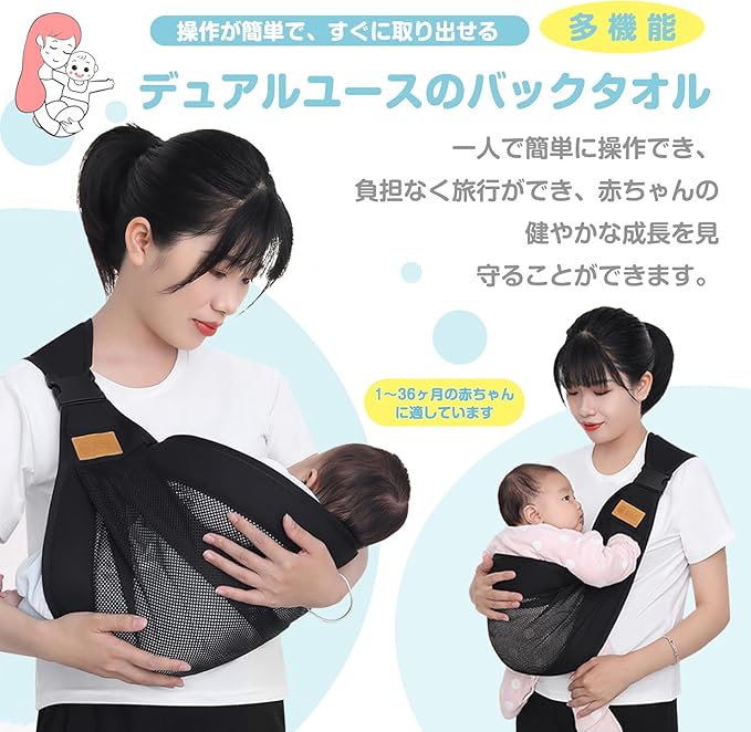 【安定】ヒップシートは伸縮性のある素材を使用。展開されたヒップシートのおかげで、赤ちゃんは背中に届き、安定していると感じることができます。肩への負担を軽減します。片手で簡単に持つことができます。