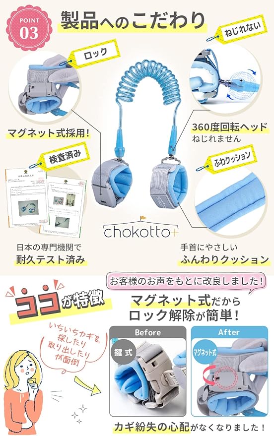 【ママ達お悩みの声、リストバンド式のまもラントが、すべて解決します!】 ・背中に着せるハーネスは脱ぎ着がめんどう、ファッションの邪魔になる、冬のモコモコ服の上から付けるのをイヤがる、リュック紐タイプはお気に入りリュックが使えない・・などなど。 →chokotto+の『まもラント』はリストバンド式!!これらのお悩み、すべて解決します。