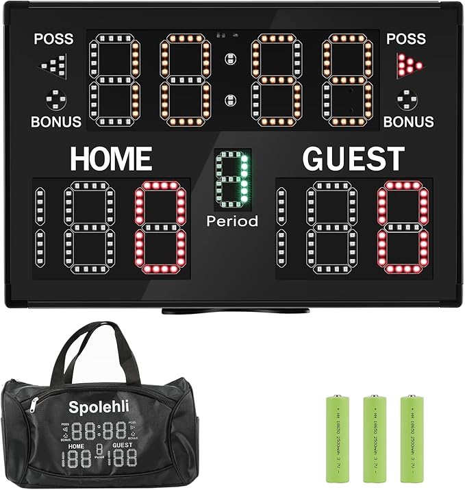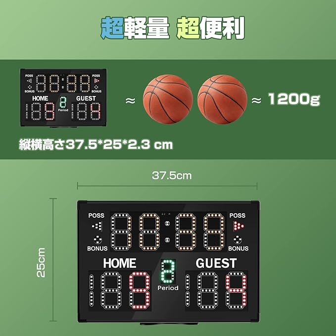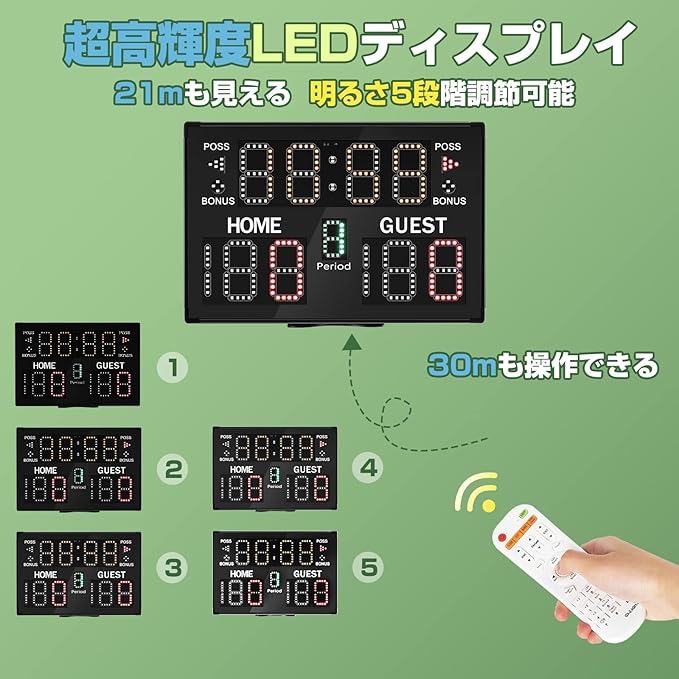 【高機能】フリースコアというモデルがある得点板、バスケットボール、サッカー、テニス、野球など様々なニーズに対応できます。超高輝度LEDディスプレイで21mも見え、明るさ5段階調節可能です。超長コントロール距離、30mも操作できます。