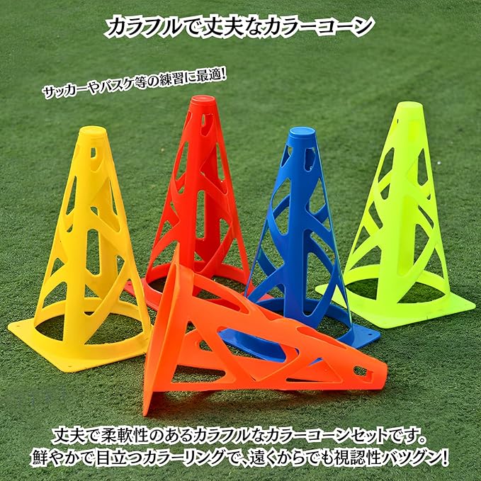 【カラフルで便利なカラーコーン】丈夫でカラフルなカラーコーン16個セットです。遠くからでも目立ちやすい鮮やかなカラーリングで、視認性に優れております。柔軟で耐久性のあるポリエチレン素材のため、練習中に踏んだりぶつかっても割れにくく、怪我をしづらい設計です。思う存分練習にお使い頂けます!